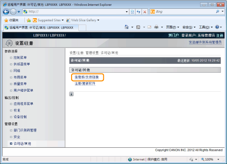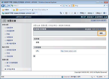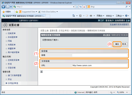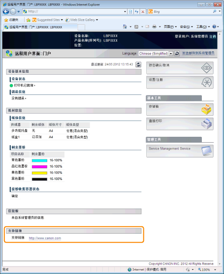 可将管理员的信息发布在远程用户界面门户页的留言板上。而且,可在门户页支持链接中设置打印机支持信息的链接,需要时可从远程用户界面访问。