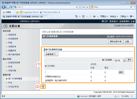 单击该按钮显示 [部门识别码管理设置] 页。设置下列项目并单击 [确定]。