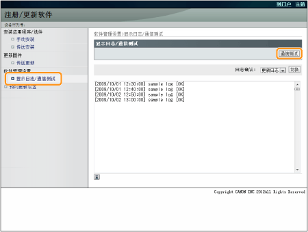 将显示系统选项/MEAP 应用程序的安装日志和固件的更新日志。