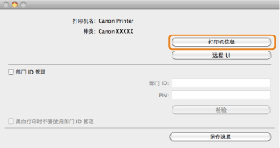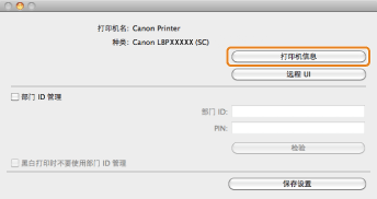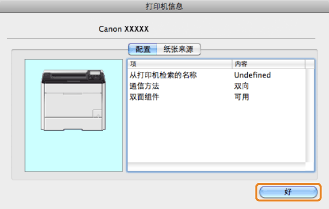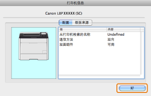 如果 [打印机信息] 对话框顶部显示的打印机驱动程序名称与显示为 [从打印机检索的名称] 的打印机名称不相符,则可能无法正确使用打印机功能。如果名称不相符,删除 [系统偏好设置] 中已添加的打印机并重新添加。有关详细信息,请参阅说明(参阅“打印机驱动程序安装指南”)。