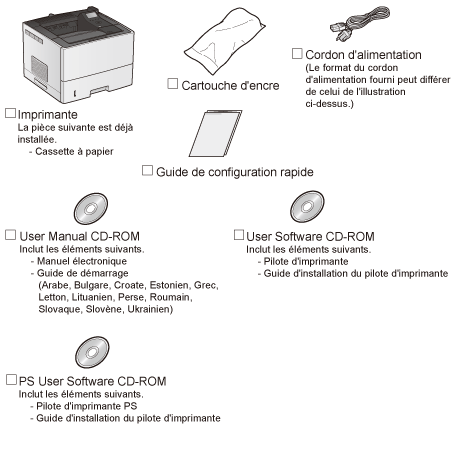 Avant d'installer l'imprimante, vérifiez que tous les accessoires fournis sont présents dans le carton.