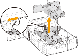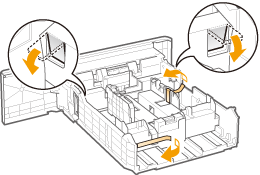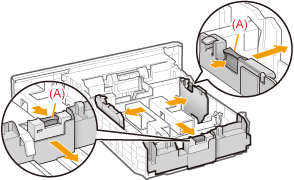 Faites coulisser les guides papier dans les directions des flèches en maintenant les leviers de déverrouillage (A).