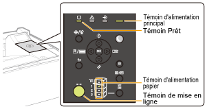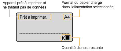 (Prêt) (vert), le témoin (En ligne) (vert) et le témoin d'alimentation papier (vert) s'allument, et le message <Prêt à imprimer.> apparaît à l'écran ; l'imprimante est prête pour l'impression. |