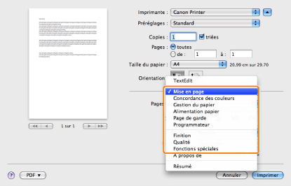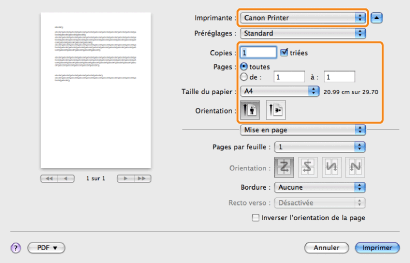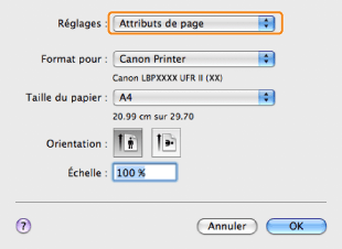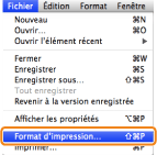 Selon l'application utilisée, il est possible que la boîte de dialogue [Format d'impression] ne s'affiche pas toujours. Si tel est le cas, vous pouvez spécifier le [Taille du papier], l'[Orientation] et la [Échelle] dans la boîte de dialogue [Imprimer].