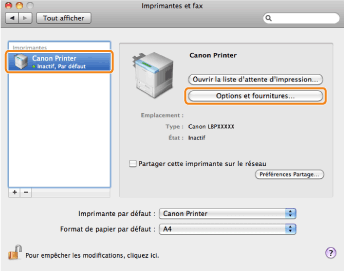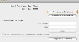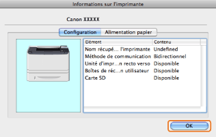 Si le nom du pilote d'imprimante affiché en haut de la boîte de dialogue [Informations d'impression] et si le nom de l'imprimante affichée comme [Nom récupéré de l'imprimante] ne correspondent pas exactement, il peut s'avérer impossible d'utiliser correctement les fonctions de l'imprimante. Si les noms ne correspondent pas, il faut supprimer l'imprimante que vous avez ajoutée dans [Préférences Système] avant de l'ajouter à nouveau. Pour de plus amples informations, reportez-vous à la REMARQUE (voir le "Guide d'installation du pilote d'imprimante").