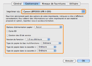 Cliquez sur [Gestionnaire] → Assurez-vous que votre imprimante est sélectionnée sous [Imprimer via] → Configurez les options installées dans l'imprimante.