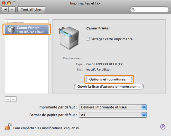 Sélectionnez l'imprimante que vous utilisez → cliquez sur [Options et fournitures].
