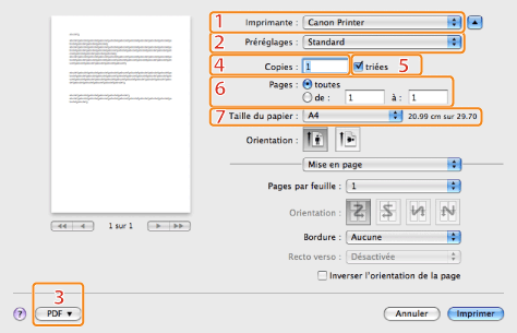 Si les fonctions susmentionnées ne peuvent être réglées dans la partie supérieure de la boîte de dialogue [Impression], il convient de les afficher et de les paramétrer dans le panneau de préférences [Copies et Pages] ou dans la boîte de dialogue [Format d'impression].