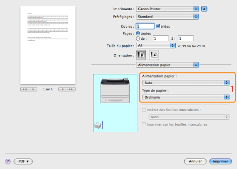 Pour imprimer sur un type de papier spécifique, indiquer la source contenant le papier approprié ou le type de papier.