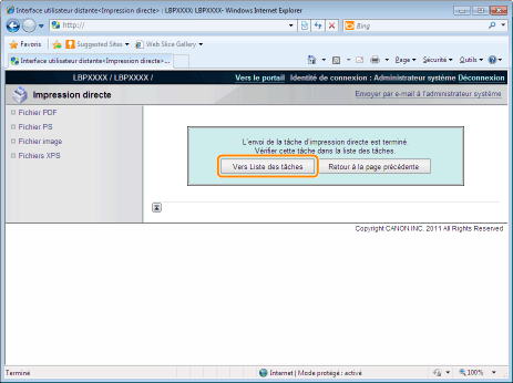 ![]() Appuyer sur [Vers Liste des tâches] pour vérifier la tâche d'impression envoyée.