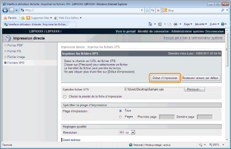 Ne continuez pas à cliquer sur [Début d'impression] pendant le transfert du fichier. Il faut parfois assez longtemps pour transférer un fichier et, si vous cliquez pendant le transfert, cela peut provoquer une erreur du fichier et empêcher son transfert.
