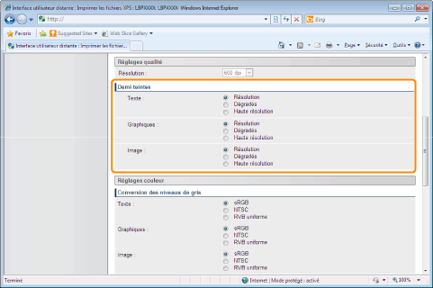 Spécifiez la méthode d'affichage des demi-tons lors de l'impression.