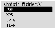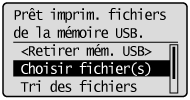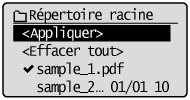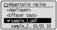 ] sera ajouté au nom du fichier. Si vous sélectionnez un fichier doté de [ ] et appuyez sur [OK], la sélection est supprimée.Si vous sélectionnez un dossier et appuyez sur [OK], la liste des fichiers contenus dans ce dossier s'affiche.