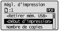Pour afficher automatiquement l'écran de mode Impression directe USBLorsque vous activez le paramètre [Afficher automatiquement l'écran d'impression directe USB] sous [Réglages d'impression directe USB] dans l'écran [Modifier Réglages de gestion] d'Interf dist, l'écran de mode "Impression directe USB" s'affiche automatiquement lorsque vous insérez un support mémoire USB.