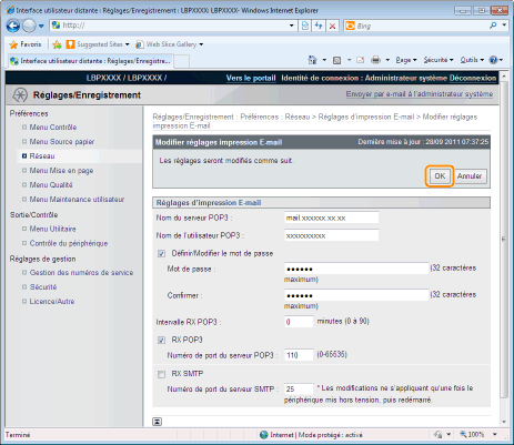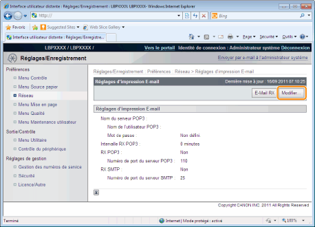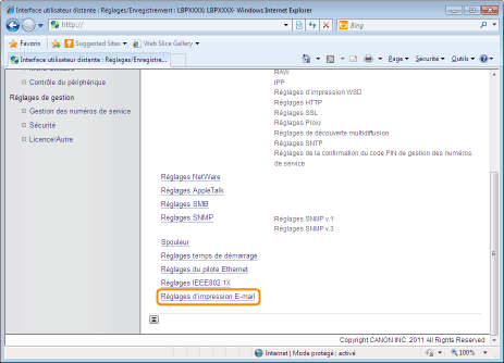 Avant d'effectuer la configuration, reportez-vous à "Attention (Comment spécifier les paramètres pour l'impression des e-mails)".
