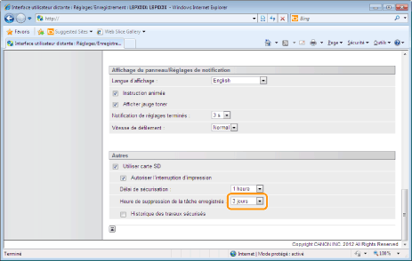 Les travaux stockés peuvent être automatiquement supprimés en définissant un délai entre la date de leur enregistrement et la date de leur suppression.