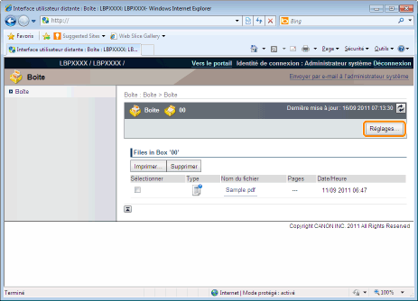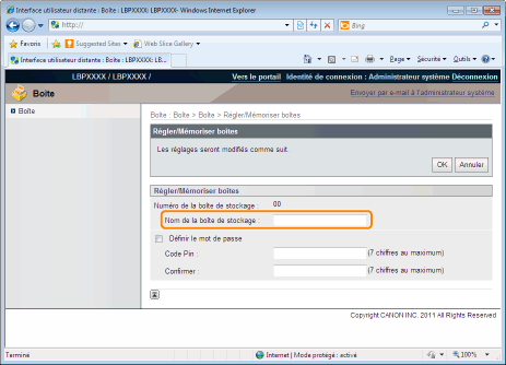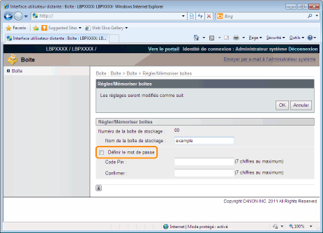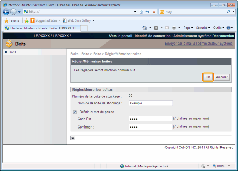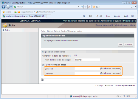 Entrez le mot de passe à spécifier sous [Code Pin ], puis entrez dans le champ [Confirmer ] le même code que celui indiqué dans [Code Pin ].