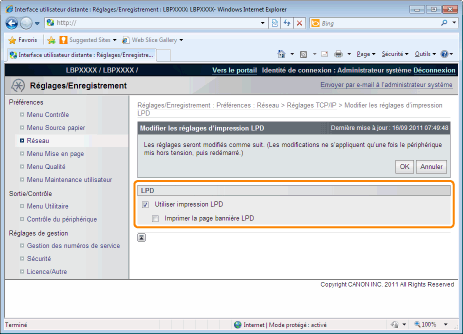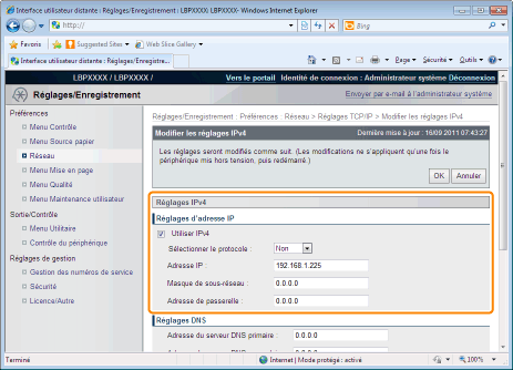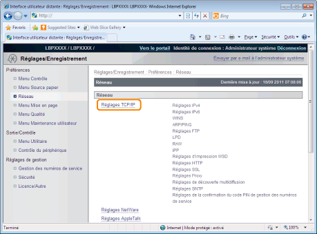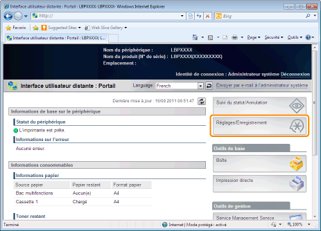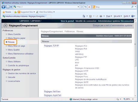 Dans Interf dist, vous pouvez définir les paramètres en accédant à l'imprimante depuis un navigateur Web sur un réseau.