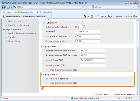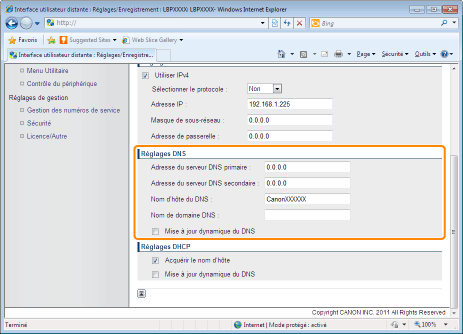 Grâce à la fonction Mise à jour dynamique du DNS, en enregistrant le [Nom d'hôte du DNS ] et le [Nom de domaine DNS ] sur le serveur DNS, il est possible d'utiliser l'adresse IP de l'imprimante sans la fixer.