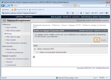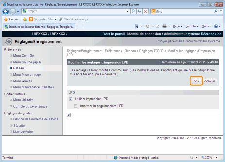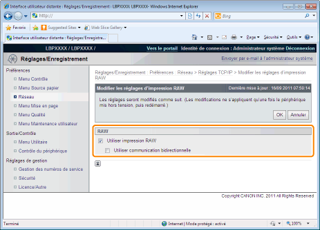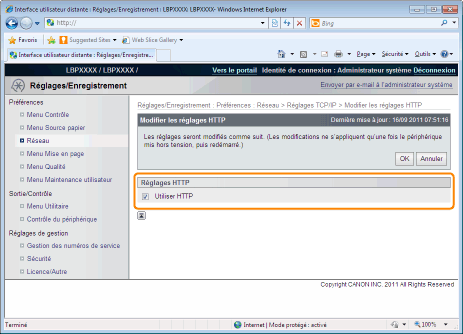Si la case est cochée, vous pouvez accéder à l'imprimante à l'aide de HTTP.