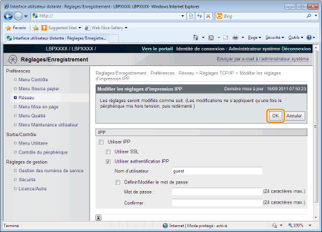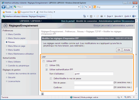 Si la case est cochée, utilisez la fonction d'authentification de l'utilisateur de l'impression IPP.