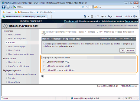 Si vous cochez la case [Utiliser l'impression WSD], la case [Utiliser la navigation WSD] est toujours cochée. Vous pouvez décocher la case [Utiliser la navigation WSD] uniquement si la case [Utiliser l'impression WSD] n'est pas cochée.