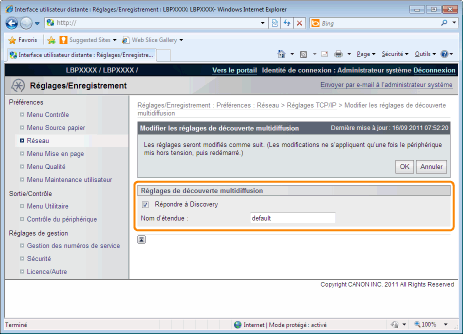 Indiquez si l'imprimante doit répondre aux recherches de périphériques sur le réseau à l'aide de Recherche multidif.