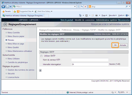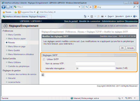 Définissez l'intervalle de demande des informations relatives au temps au serveur NTP par l'imprimante. Vous pouvez définir des intervalles compris entre [1] et [48] (heures).