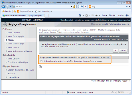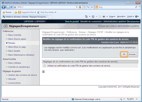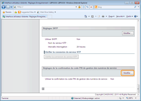 Cliquez sur [Modifier...] dans [Réglages de confirmation du code PIN de gestion des numéros de service].