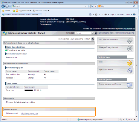 Vous pouvez publier des messages de l'administrateur sur un forum électronique de la page du portail de l'Interf dist. Vous pouvez également définir des liens vers des informations relatives à l'assistance de l'imprimante au niveau des liens d'assistance de la page du portail, et les rendre accessibles à partir de l'Interf dist, si nécessaire.