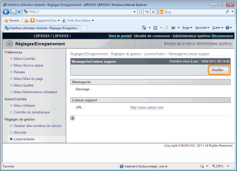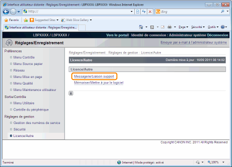 Dans le menu [Réglages/Enregistrement], sélectionnez [Messagerie/Liaison support] dans [Licence/Autre] sous [Réglages de gestion].