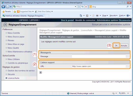 Si vous êtes connecté en mode de gestionnaire du système, vous pouvez modifier les messages sur le forum électronique ainsi que la destination des liens d'assistance.