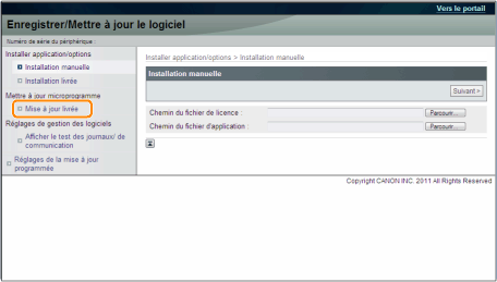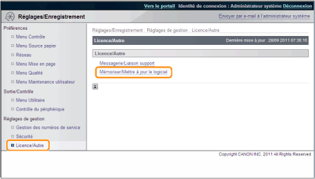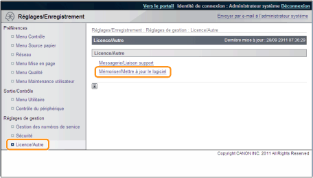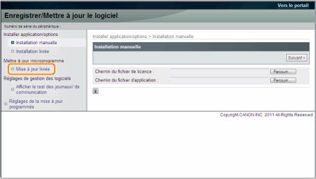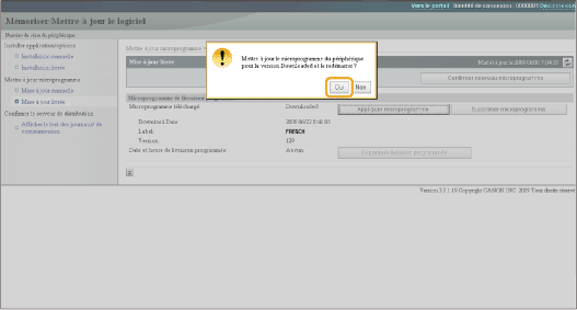 Durée estimée nécessaire pour appliquer le micrologicielLa durée nécessaire à l'application du micrologiciel téléchargé est d'environ 20 minutes. Cette opération peut prendre davantage de temps en fonction de la configuration système et de l'environnement réseau de votre imprimante.