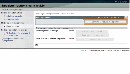 Le nouveau micrologiciel est téléchargé. ![]() Si le calendrier de distribution est configuré sur [Livier à une date et une heure spécifiée]