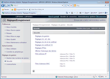 Seul l'administrateur (utilisateur connaissant le mot de passe) peut configurer les paramètres ou exécuter des opérations liées à la gestion de l'imprimante en entrant le mot de passe de l'administrateur.