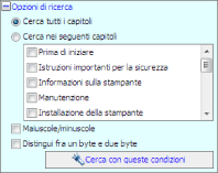 ![]() Le opzioni di ricerca possono essere utilizzate per specificare il capitolo in cui cercare, la sensibilità o meno a maiuscole e minuscole e la differenziazione o meno tra caratteri a un byte e a due byte.