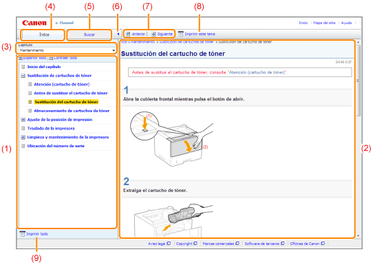 Haga clic para mostrar u ocultar el panel de contenido del capítulo o el panel de búsqueda.