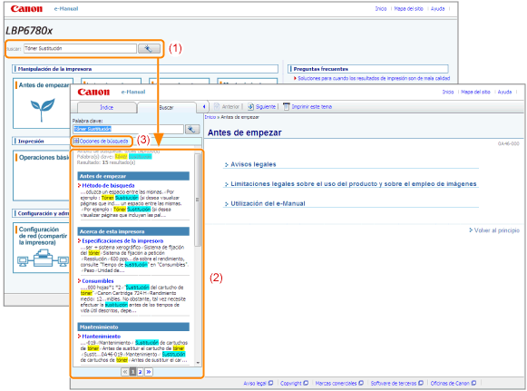 Por ejemplo : Tóner Sustitución (si desea visualizar páginas que incluyan las palabras "Tóner" y "Sustitución")