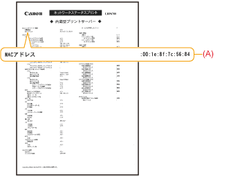 ネットワークステータスプリントが印刷されます。 MACアドレス(A)はネットワークステータスプリントの左上の「Ethernetドライバー設定」に表示されます。