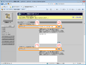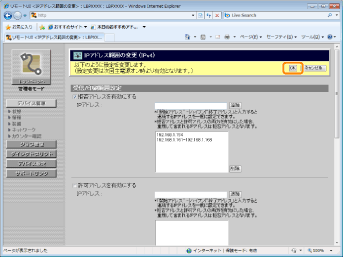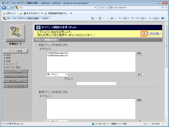 [拒否アドレスを有効にする]と[許可アドレスを有効にする]の両方にチェックマークを付けると、以下のIPアドレスからの設定や参照ができなくなります。