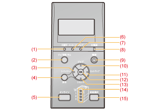 ジョブランプが点灯・点滅している状態(データ処理中・データ受信中)で押すと、ジョブのリストを表示します。リストからジョブを選んでキャンセルできます。本文中では[