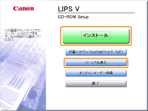 [マニュアル表示]ボタン:「プリンタードライバーインストールガイド」を表示するには、最初にクリックします。「プリンタードライバーインストールガイド」は、インストール開始後に表示できません。