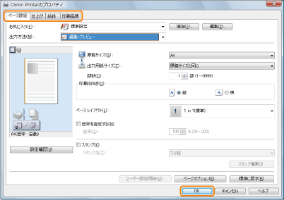印刷設定画面の表示方法については、「プリンタードライバーを表示して印刷する」または「あらかじめ印刷の設定をする」を参照してください。