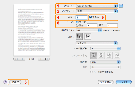 Mac OS X 10.2.8~10.4.xをお使いの場合は、[印刷部数と印刷ページ]ダイアログで以下の設定を行います。下のプリンタードライバー画面上の同じ番号の箇所で、設定することができます。