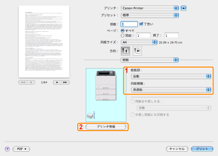 下のプリンタードライバー画面上の同じ番号の箇所で設定できます。