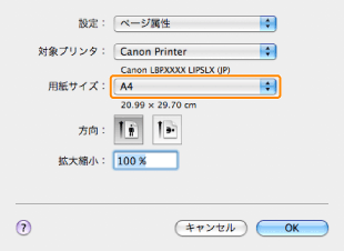 Mac OS X 10.5.xの場合、アプリケーションソフトウェアによっては、[ページ設定]ダイアログは表示されません。このようなアプリケーションソフトウェアでは、[プリント]ダイアログで用紙サイズ、用紙の向き、拡大縮小率の設定を行います。[プリント]ダイアログの表示方法については「プリンタードライバーを表示して印刷する」を参照してください。