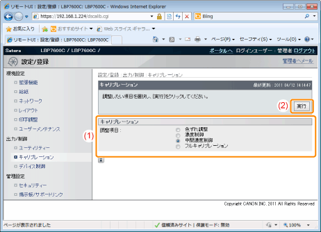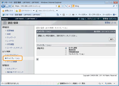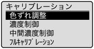 ]で「色ずれ調整」、「濃度制御」、「中間濃度制御」、「フルキャリブレーション」から調整したい項目を選択して、[OK]を押します。