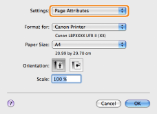 In Mac OS X 10.5.x, the [Page Setup] dialog box may not be displayed, depending on the application you are using. If this is the case, you can specify the page size, page orientation, and scaling in the [Print] dialog box.