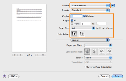 Select your printer from [Printer] → set the number of copies, which pages to print, etc.