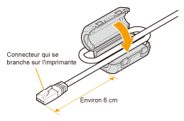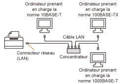 Pour le câble LAN, utilisez un câble à paires torsadées de catégorie 5 ou supérieure. Si vous souhaitez raccorder l'imprimante à un réseau Ethernet 100BASE-TX ou 1000BASE-T, tous les périphériques à raccorder au LAN (concentrateur, câble réseau (LAN) et carte réseau pour l'ordinateur) doivent prendre en charge la norme 100BASE-TX ou 1000BASE-T.